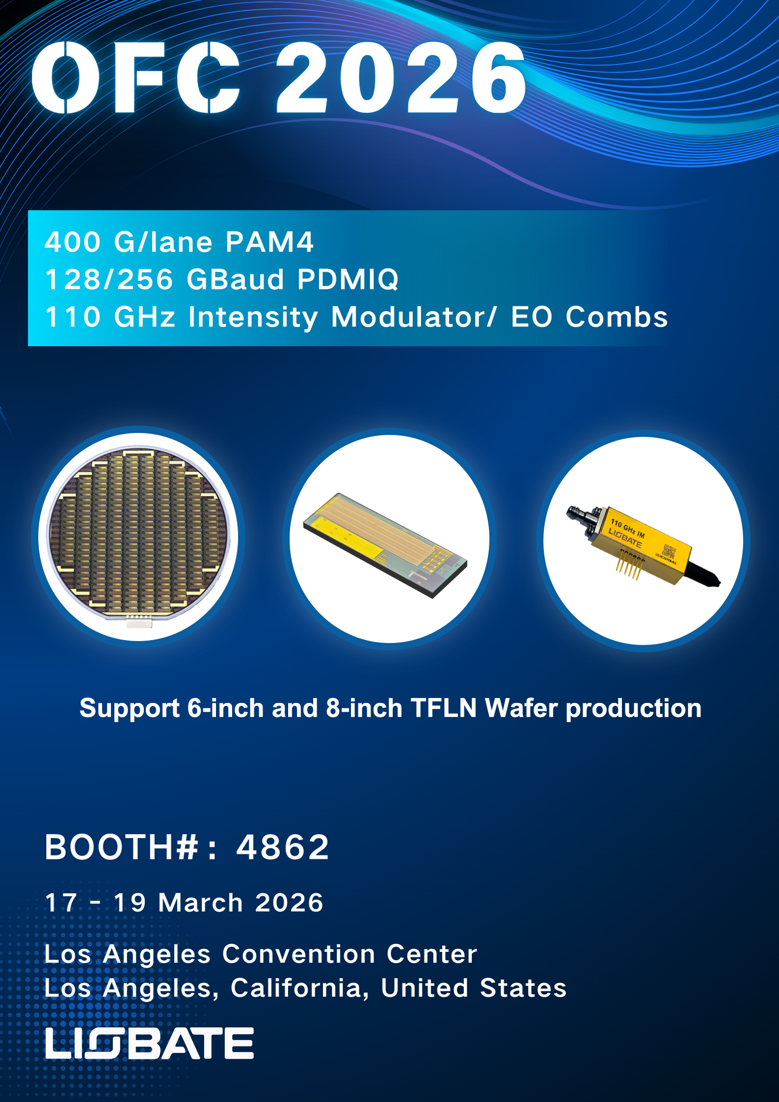 Liobate is pleased to announce its participation in OFC 2026, taking place from March 17–19 at the Los Angeles Convention Center.At this year's exhibition, we will spotlight our latest breakthroughs in Thin-Film Lithium Niobate (TFLN) chips and devices, including: